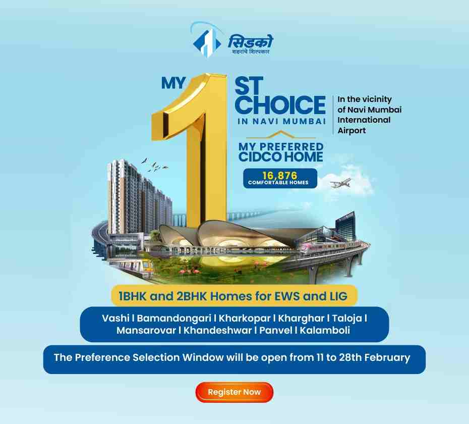 Deadline Extended Till March 19, 2026The City and Industrial Development Corporation (CIDCO) has extended the deadline for selecting preferred flats under its housing scheme titled “My Preferred CIDCO Home – My First Choice in Navi Mumbai.” Applicants can now select their preferred housing option until March 19, 2026. The decision was taken in view of the overwhelming response from citizens and to give more time to eligible applicants to secure their dream home. 16,876 Flats Under PMAYA total of 16,876 residential units are being offered under the Pradhan Mantri Awas Yojana (PMAY) for Economically Weaker Sections (EWS) and Low Income Group (LIG) categories. The scheme aims to provide affordable housing opportunities to common citizens in Navi Mumbai. |