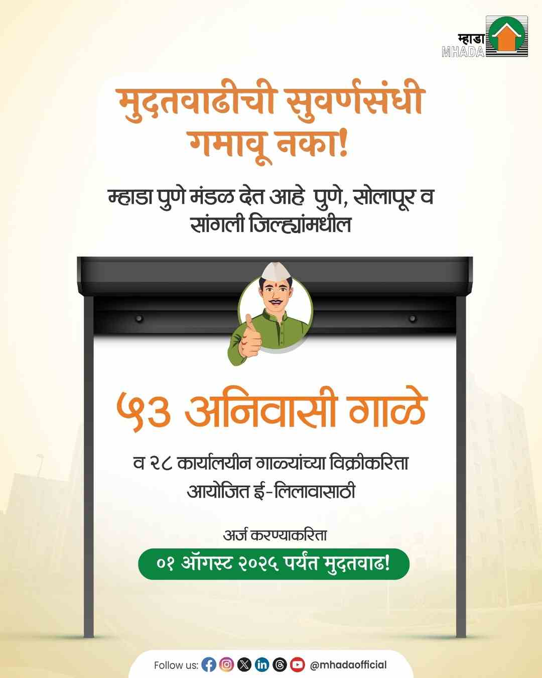 The deadline to apply for the e-auction organized by MHADA Pune Board for the sale of 53 non-residential and 28 office premises across Pune, Solapur, and Sangli districts has been extended till 1st August 2025. Don’t miss this golden opportunity!