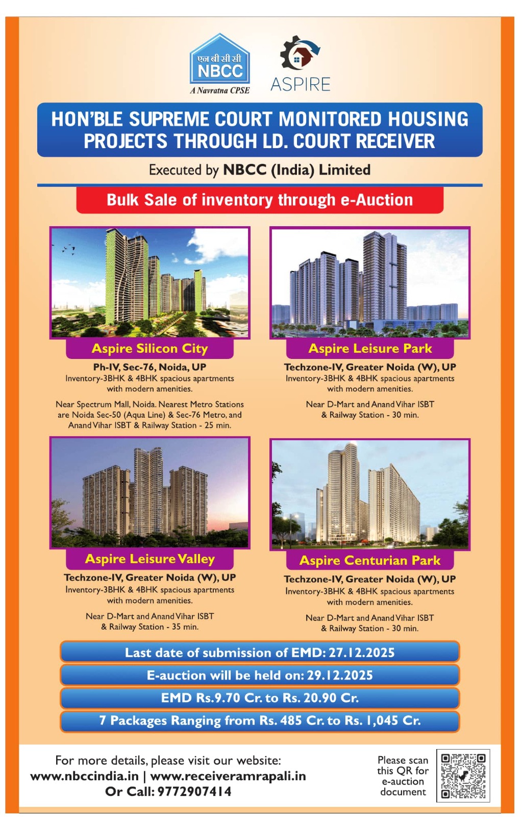The Honble Supreme Court monitored housing projects of Aspire Group executed by NBCC India Limited have been opened for bulk sale through e auction under the supervision of the Ld Court Receiver. The move aims to liquidate unsold residential inventory in major housing projects located in Noida and Greater Noida in Uttar Pradesh providing an opportunity for bulk buyers developers investors and institutional purchasers to acquire premium residential assets at competitive prices.