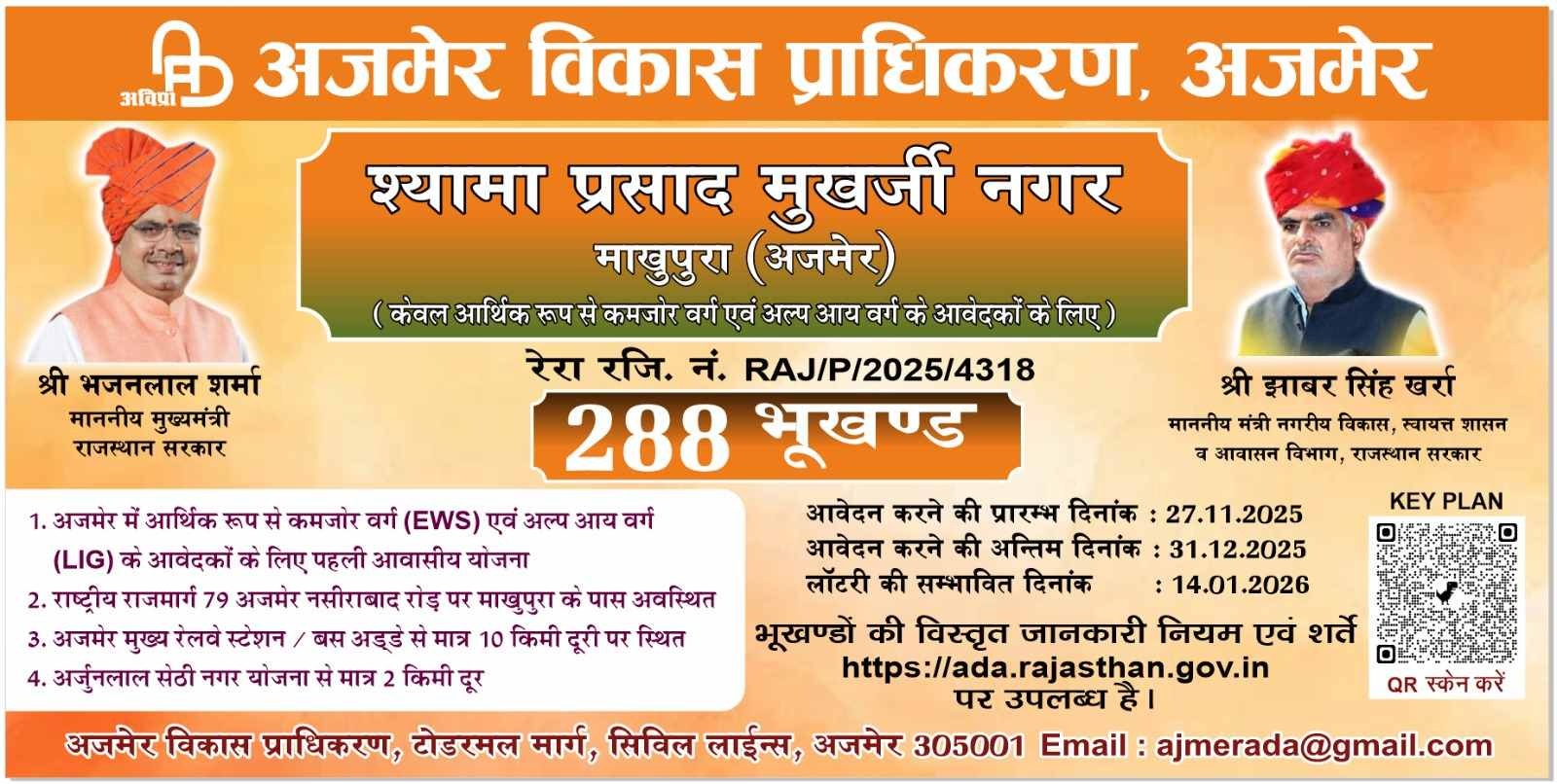 The Ajmer Development Authority (ADA) has announced a new affordable housing scheme titled Shyama Prasad Mukherjee Nagar at Makhupura, aimed exclusively at applicants from the Economically Weaker Section (EWS) and Low-Income Group (LIG). Under the project, 288 residential plots have been made available through an e-lottery system.