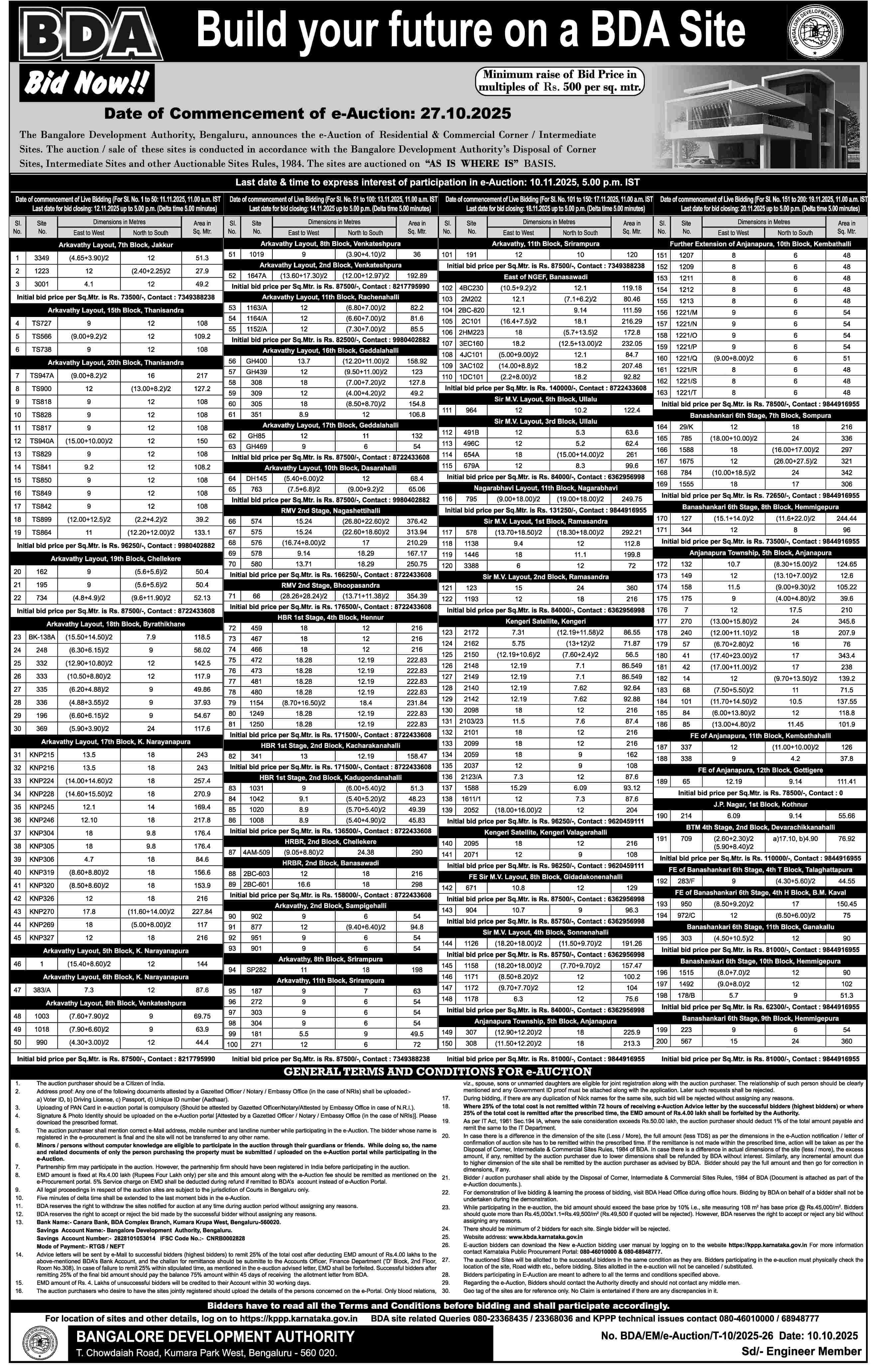 The Bangalore Development Authority (BDA) has officially announced the e-auction of 200 residential and commercial sites across major layouts in Bengaluru. The auction will begin on 27 October 2025, offering opportunities for individuals and investors to own premium plots in prime localities developed by the BDA.