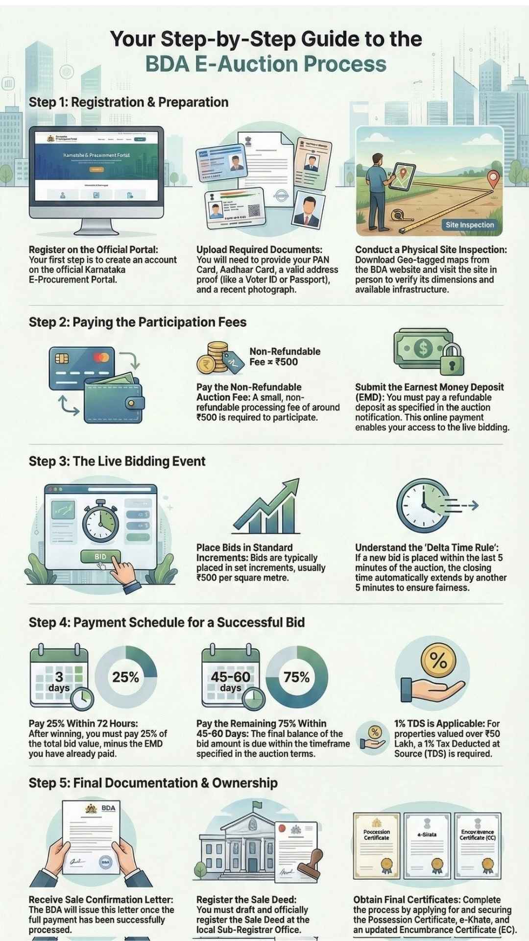 - The Bangalore Development Authority (BDA) is responsible for urban planning and infrastructure development in Bangalore. Through e-auctions, BDA sells land and properties, often at competitive prices, making these auctions a valuable opportunity for investors.