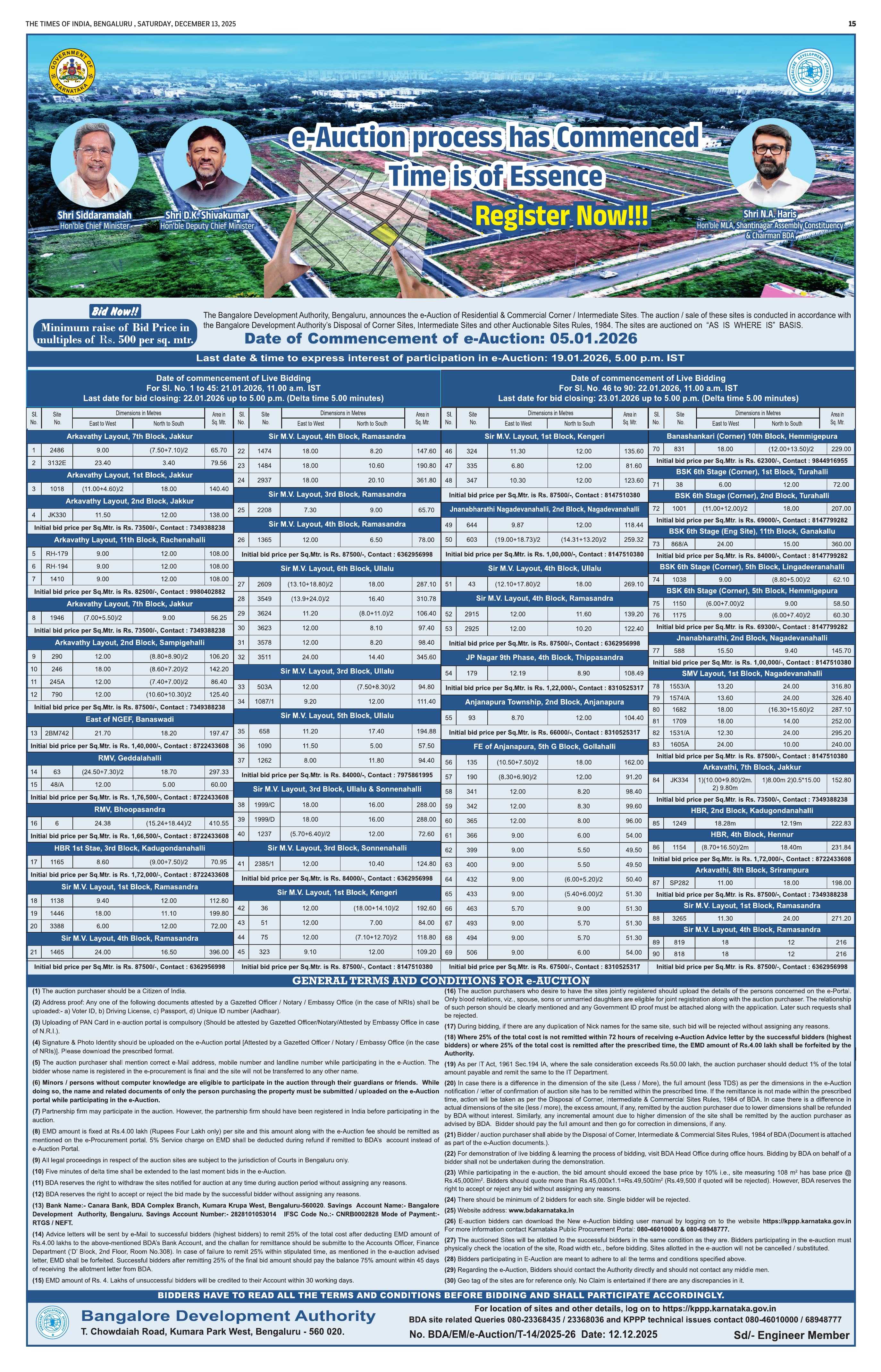 The Bangalore Development Authority (BDA) has commenced the e-auction process for 90 residential and commercial corner and intermediate sites across various layouts in Bengaluru. The notification was published in The Times of India, Bengaluru edition, under the Government of Karnataka.