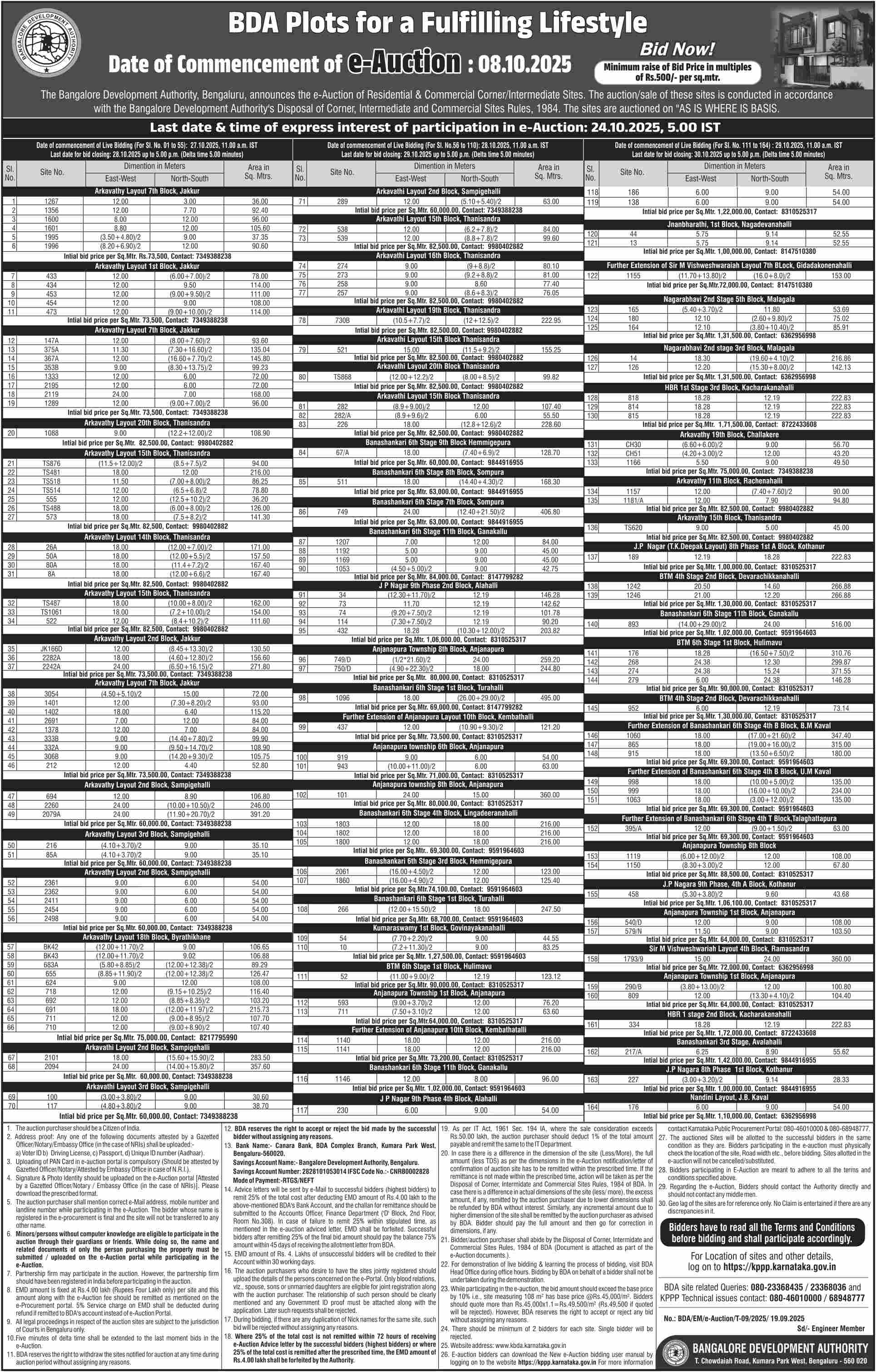 The Bangalore Development Authority (BDA), Bengaluru, is conducting an e-Auction of residential and commercial corner/intermediate sites. These sites will be sold on an “AS IS WHERE IS” basis under the BDA’s Disposal Rules, 1984.
