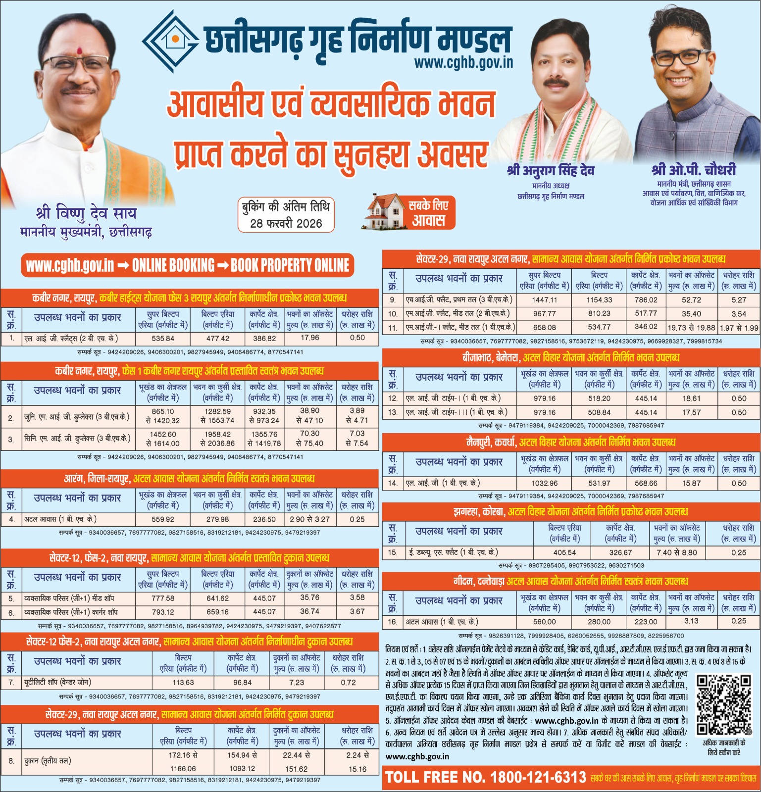 Citizens can access complete details, including layout plans, cost structure, property specifications, and booking options, by visiting the official website www.cghb.gov.in. The Housing Board has also provided a toll-free helpline: 1800-121-6313 for assistance.