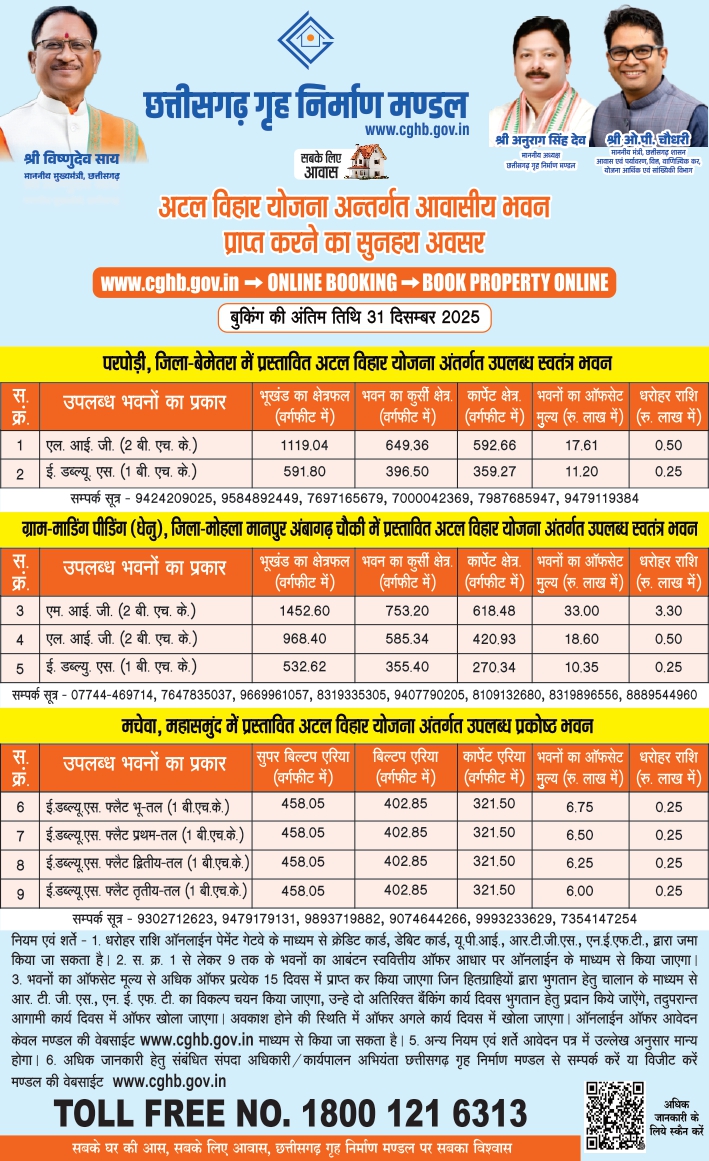 The Chhattisgarh Housing Board (CGHB) has announced a golden opportunity for home buyers under the Atal Vihar Yojana 2025. This scheme offers affordable residential houses and flats across different districts of Chhattisgarh, including Bemetara, Mohla-Manpur (Ambagarh Chowki), and Mahasamund. Interested buyers can book their homes online through the official website www.cghb.gov.in, with the last date of booking being 31st December 2025.