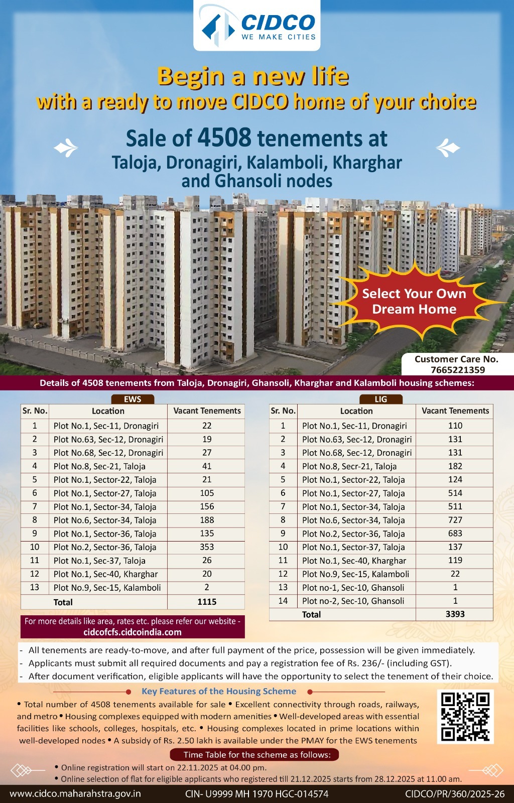 Navi Mumbai: In a major housing initiative, the City and Industrial Development Corporation (CIDCO) has announced the sale of 4,508 ready-to-move tenements across five key Navi Mumbai nodes — Taloja, Dronagiri, Kalamboli, Kharghar and Ghansoli. The corporation has invited homebuyers to participate in the scheme and select a home of their choice through an online process.