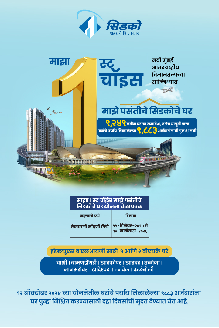CIDCO has also announced that applicants who were allotted housing options under the October 2024 scheme will be given a 10-day window to reconfirm or finalise their house selection under the new ‘My First Choice’ initiative.