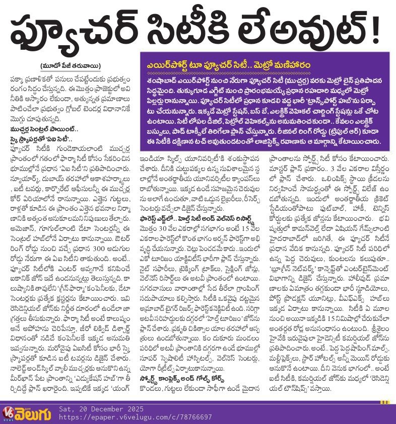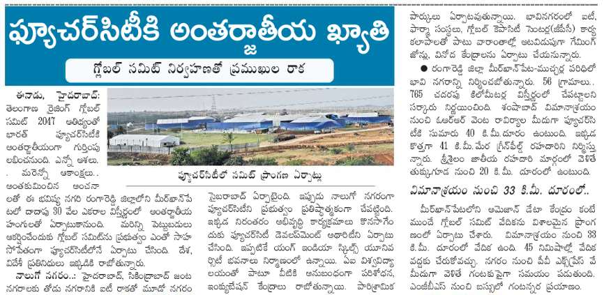 The Telangana government is preparing a well-planned Future City project with strict transparency and global standards, adopting a global tendering process.