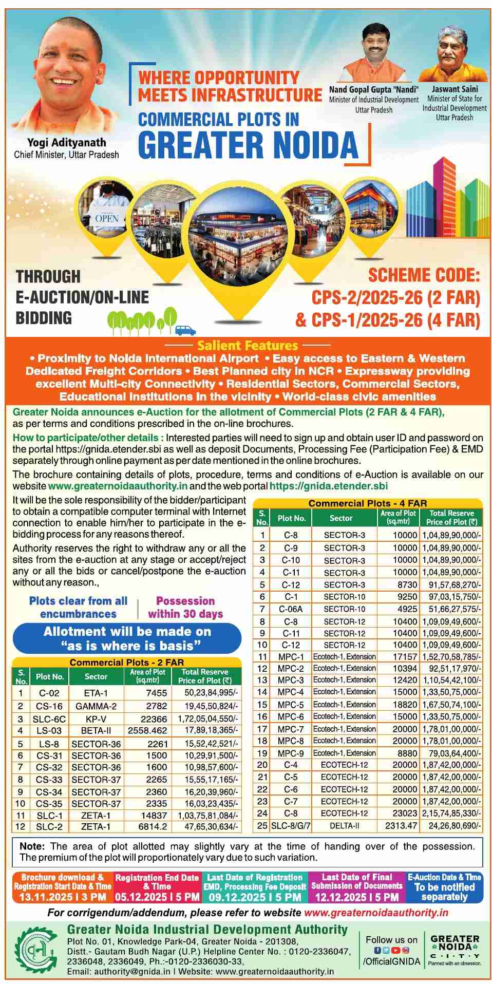 In a significant move to attract investments and promote planned urban growth, the Greater Noida Industrial Development Authority (GNIDA) has announced the launch of its new e-auction scheme for commercial plots under the codes CPS-1/2025-26 (4 FAR) and CPS-2/2025-26 (2 FAR). The plots are located across prime sectors of Greater Noida, offering investors an opportunity to secure land in one of the most strategically developed regions of the National Capital Region (NCR).