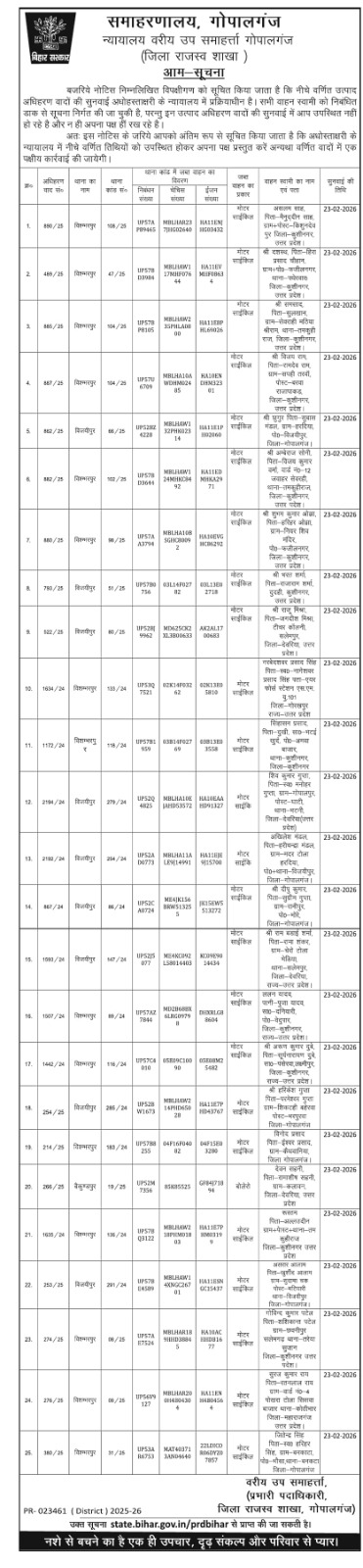 The District and Sessions Court, Gopalganj, has announced the auction of 25 seized vehicles in connection with various criminal cases registered across the district. The auction will be conducted on February 23, 2026, as per orders issued by the competent court.