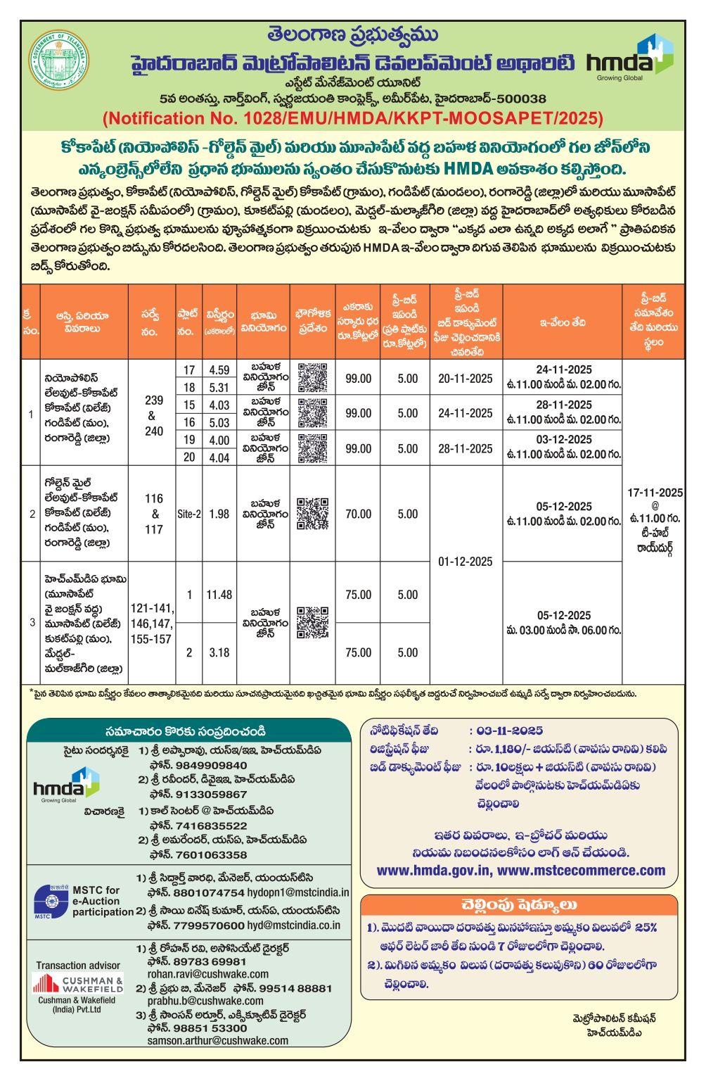 | Neopolis Layout, Kokapet (Rangareddy Dist.) | Multi Use Zone | 4.59 | ₹99.00 Cr | ₹5.00 Cr | 24-Nov-2025 |