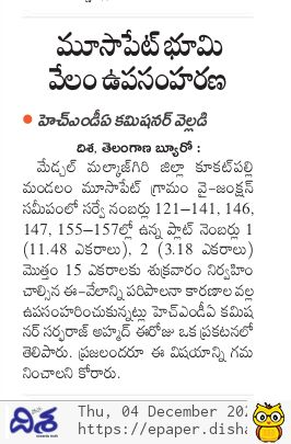 HMDA Commissioner Sarfaraz Ahmed announced today in a statement that the e-auction scheduled for Friday for a total of 15 acres in plot numbers 1 (11.48 acres) and 2 (3.18 acres) in survey numbers 121-141, 146, 147, 155-157 near the Y-junction in Moosapet village, Kukatpally mandal, Medchal-Malkajgiri district, has been withdrawn due to administrative reasons. He requested all the people to take note of this matter.
