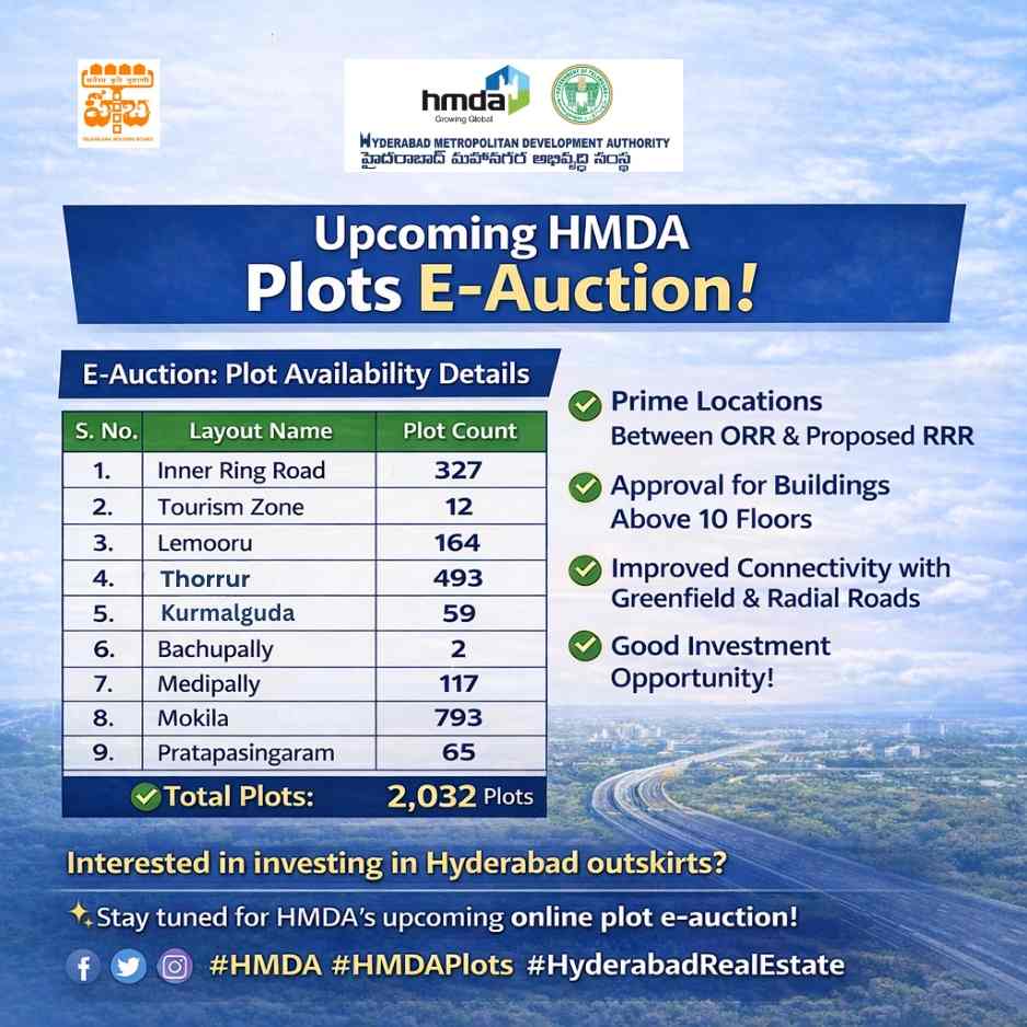 The Hyderabad Metropolitan Development Authority (HMDA) has invited bids for the sale of government-owned land parcels in some of Hyderabad’s most promising investment zones — Kokapet (Neopolis–Golden Mile) and Moosapet (near Y-junction). These plots are being offered on an “as is where is” basis through an online e-auction, providing investors with a rare opportunity to own encumbrance-free, multi-use land in one of India’s fastest-growing metropolitan regions.