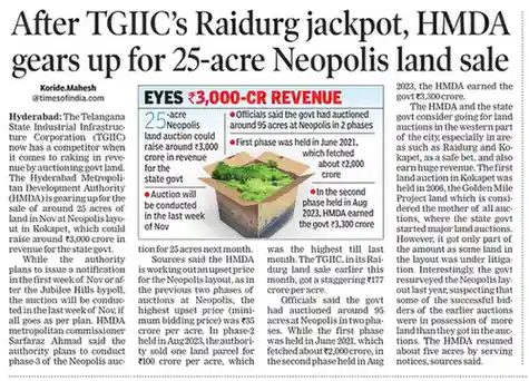 While the Telangana State Industrial Infrastructure Corporation (TSIIC) has been leading in land-based revenue generation, HMDA is now entering the race with renewed enthusiasm. The upcoming Neopolis auction of 25 acres in Kokapet is expected to generate ₹3,000 crore, placing HMDA on par with TSIIC’s high-value auctions. The auction notification is likely to be issued in the first week of November, possibly after the Jubilee Hills by-election.