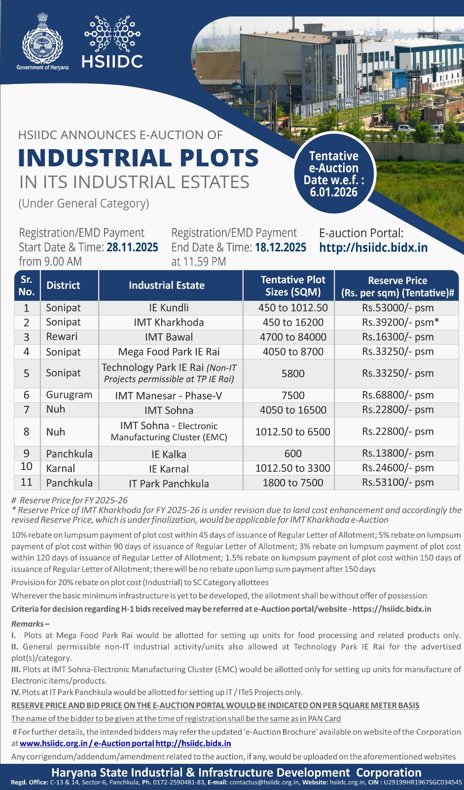 | HSIIDC E-Auction Date | 31st October 2025 (7:00 AM - 11:00 AM) |