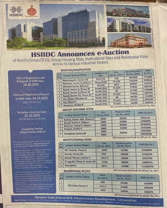 HSIIDC E-Auction Date | 31st October 2025 (7:00 AM - 11:00 AM) |
