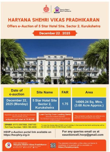 Kurukshetra: Haryana Shehri Vikas Pradhikaran (HSVP) has announced the e-auction of a prime 5-Star Hotel Site located in Sector 2, Kurukshetra. The e-auction is scheduled to be held on Monday, December 22, 2025, and will begin at 10:00 AM.