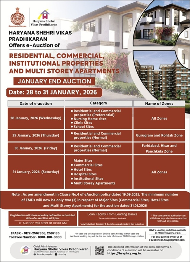 In a significant policy update, HSVP clarified that as per the amended e-auction policy dated September 19, 2025, the minimum number of EMDs required for major sites — including commercial and hotel sites — has been reduced to two for the January 31 auction.