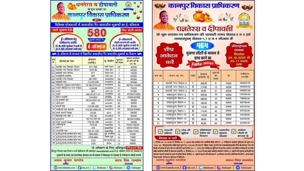 On the auspicious occasion of Dhanteras and Diwali 2025, the Kanpur Development Authority (KDA) has announced a major opportunity for homebuyers and investors, offering more than 1,000 residential and non-residential plots through e-auction and lottery schemes.