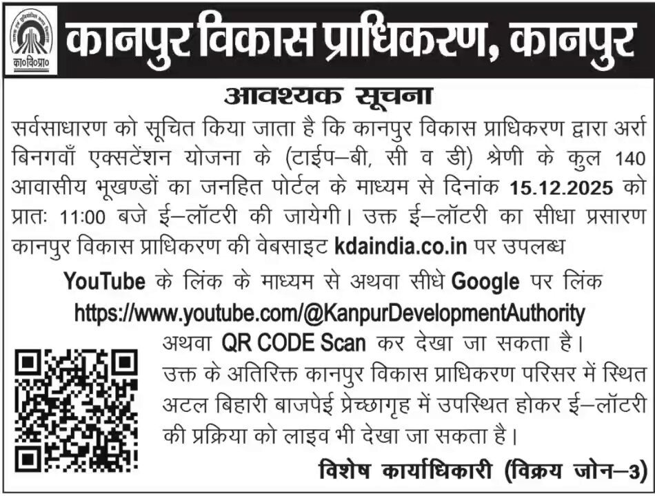 The Kanpur Development Authority (KDA) is set to announce the Arra Bingawan Residential Plot Scheme draw result on 15 December 2025. The selection of applicants will be done through a fully online e-lottery system, ensuring transparency in the allotment process. No offline lottery will be conducted.