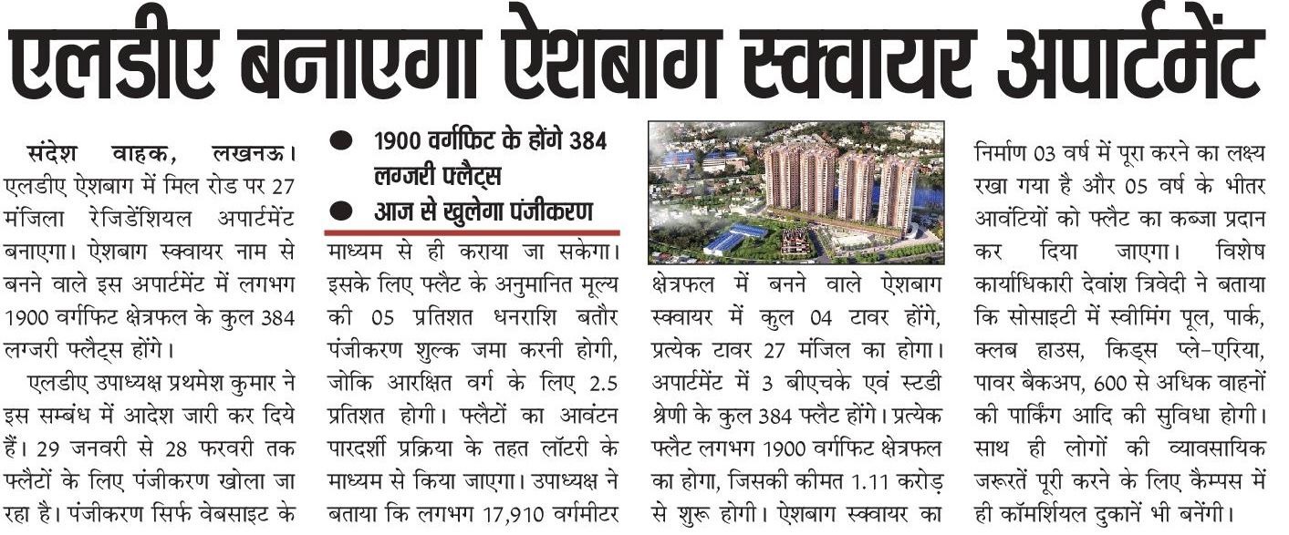The Lucknow Development Authority (LDA) will construct a 27-storey residential apartment complex on Mill Road in the Alambagh area. The project will be known as Eshava Square.