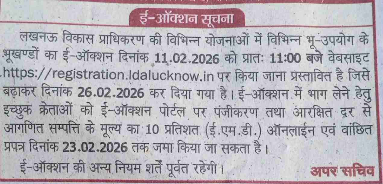 The Lucknow Development Authority (LDA) has issued an important notice regarding the extension of dates for the e-auction of plots under its various development schemes.