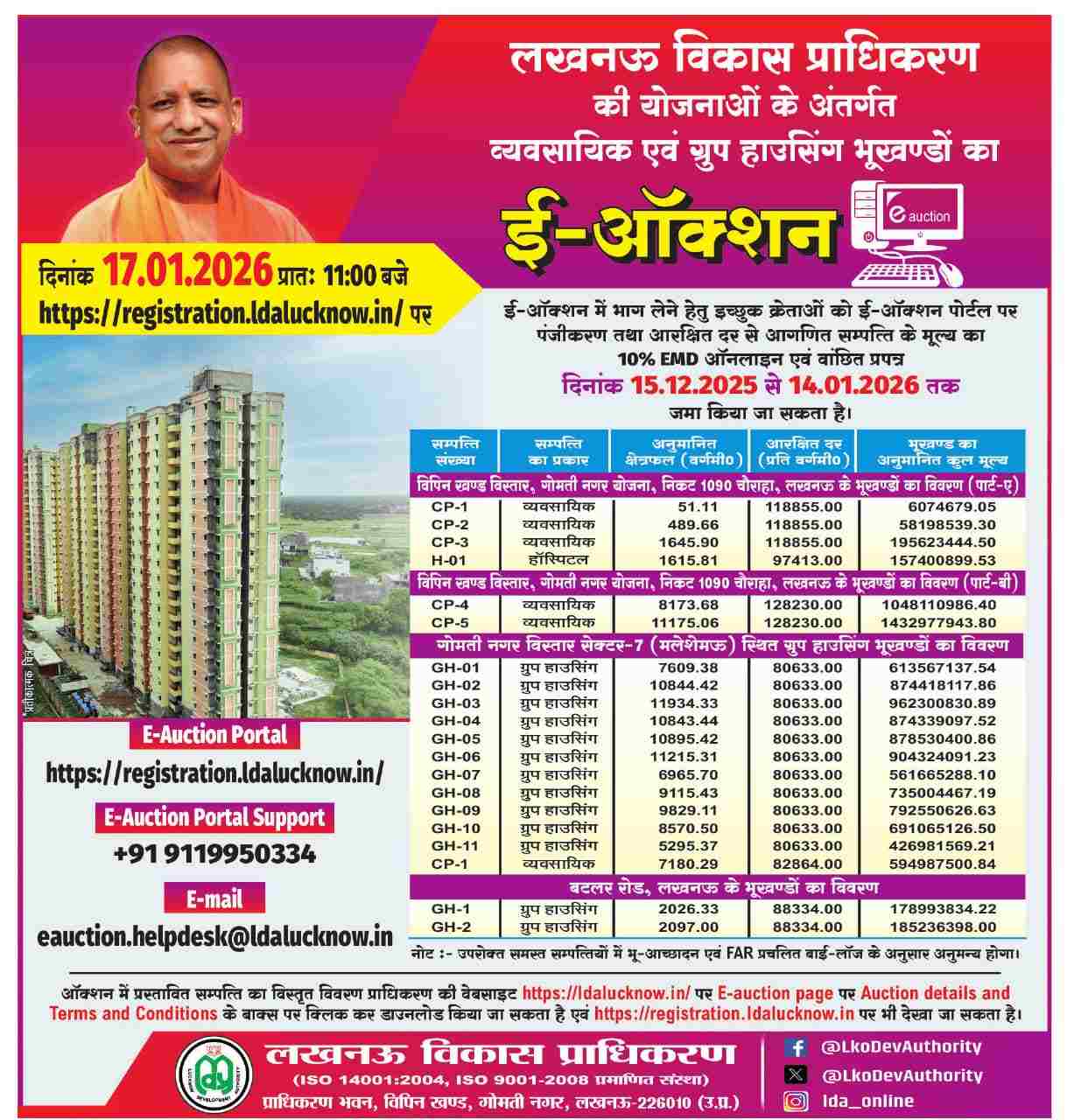 This notice is for potential bidders of commercial and group housing plots under LDA’s development schemes in Gomti Nagar and other areas. E-auction is online, and registration along with EMD deposit is required before the auction date.