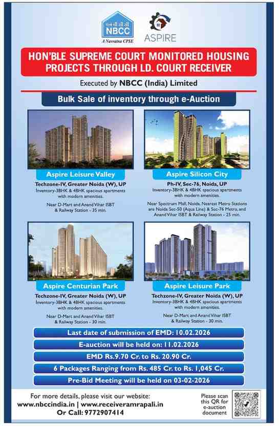 Officials said the Supreme Court monitored sale through the Court Receiver ensures transparency and legal clarity in the transaction process which is expected to boost buyer confidence and attract institutional participation. Real estate market experts said the bulk sale of Aspire Group inventory by NBCC is likely to create renewed interest in the Noida and Greater Noida housing market and could improve liquidity for stalled and legacy housing projects in the NCR region.