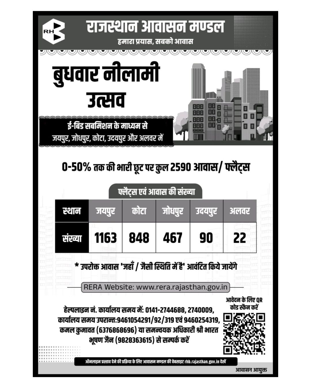The Rajasthan Housing Board (RHB) has announced its upcoming “Wednesday Auction Festival”, offering homebuyers a unique opportunity to purchase residential flats and houses at significant discounts. The auction will be conducted through an E-bid submission system across multiple cities including Jaipur, Kota, Jodhpur, Udaipur, and Alwar.
