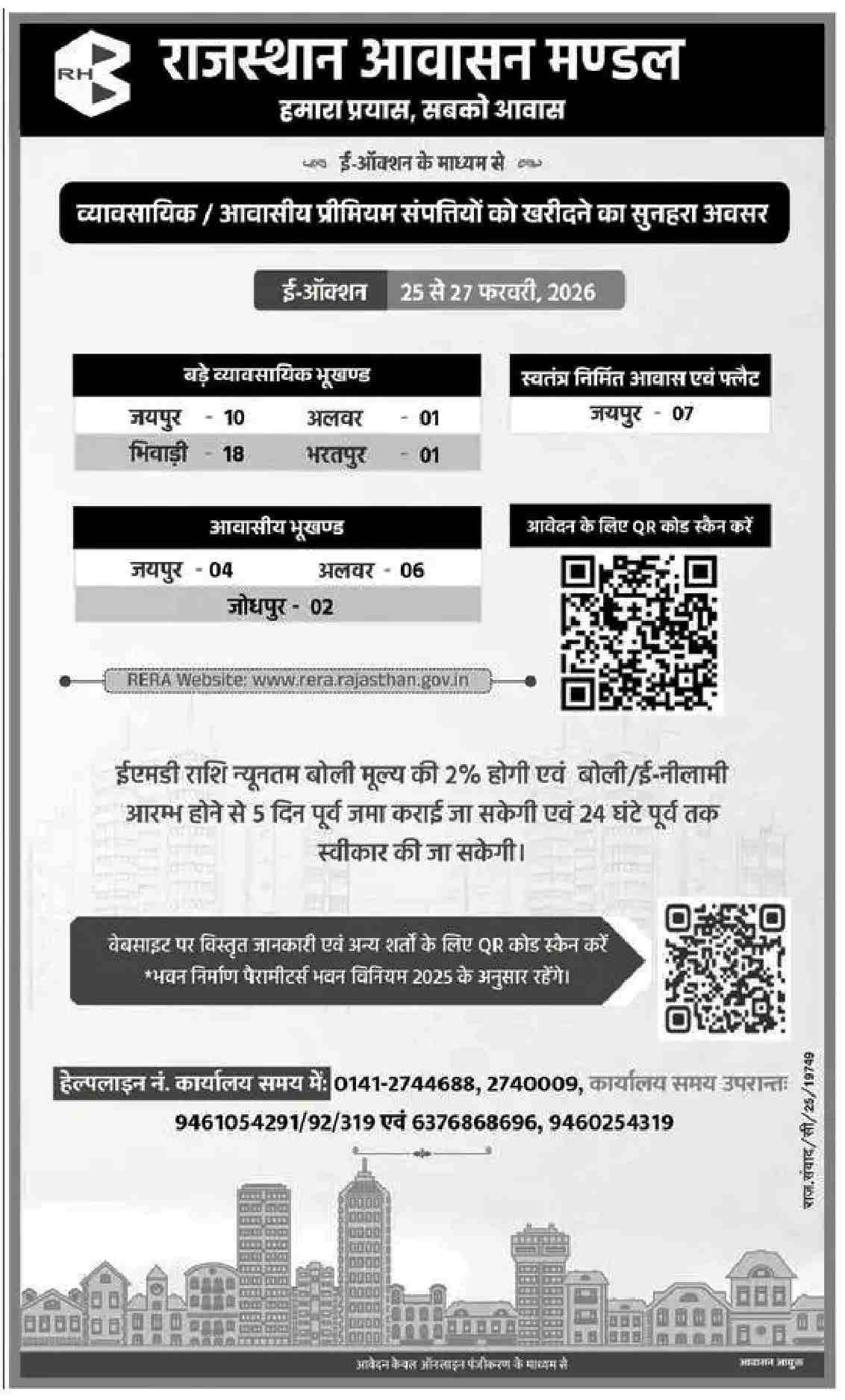 Jaipur, February 2026: Rajasthan Housing Board (RHB) has announced a major e-auction for premium residential and commercial properties across key cities in Rajasthan. The online auction will be conducted from February 25 to February 27, 2026, offering buyers an excellent opportunity to invest in prime real estate.