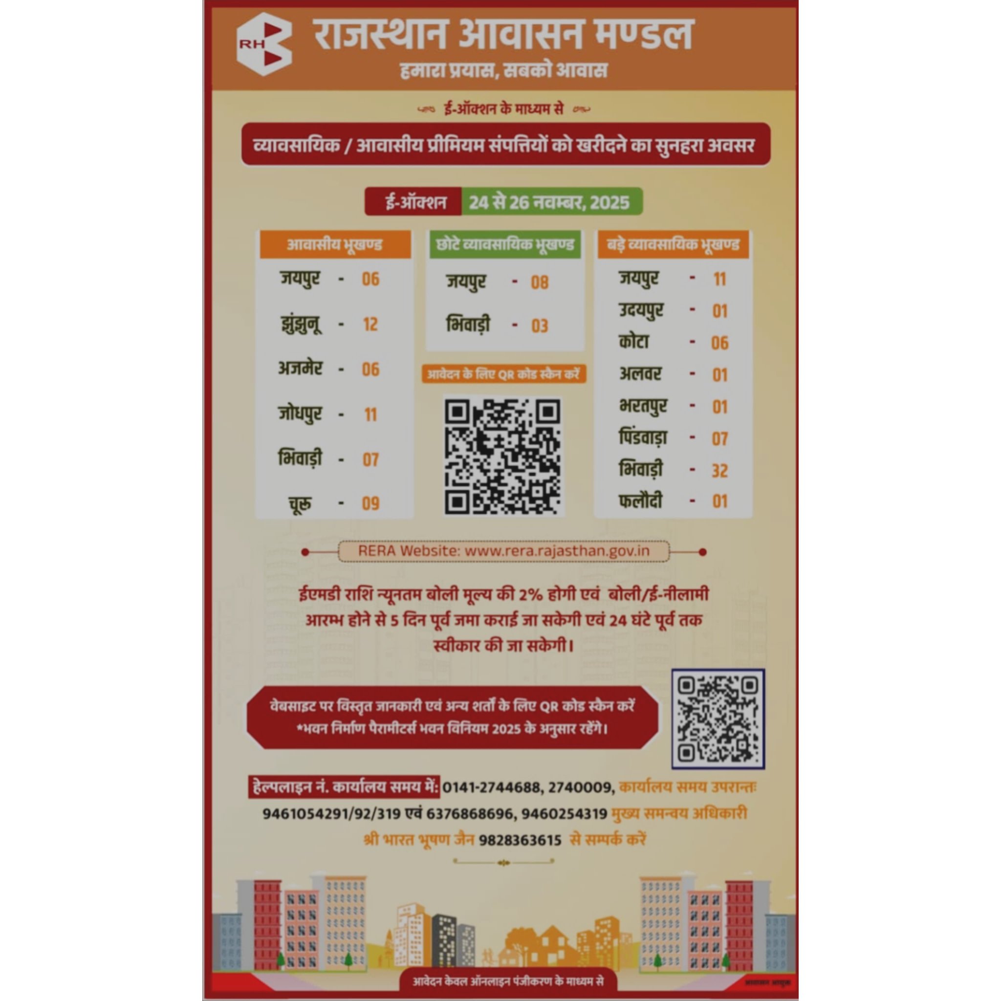 The Rajasthan Housing Board (RHB) has released the schedule for its upcoming e-auction of residential, small commercial, and large commercial properties. The auction will be conducted online from 24 November to 26 November 2025, offering buyers an opportunity to purchase premium RHB properties across multiple cities.