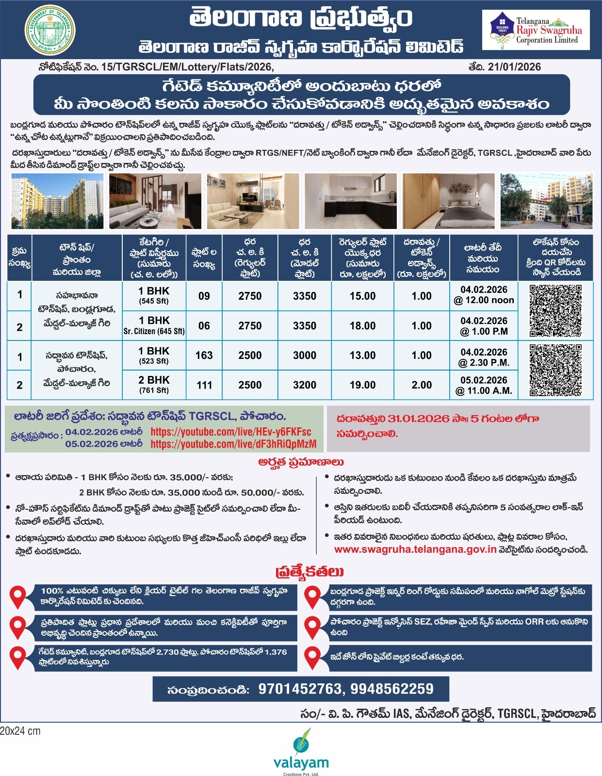 The lotteries will be conducted at Sadbhavana Township in Pocharam and streamed live on YouTube. The live links have been provided by the corporation for public transparency.