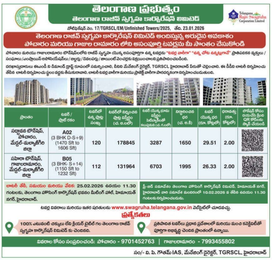 In a major boost to affordable housing, the Telangana government, through the Telangana Rajiv Swagruha Corporation Limited (TGRSCL), has announced the sale of ready-to-occupy flats at Bandlaguda and Pocharam townships through a public lottery system.