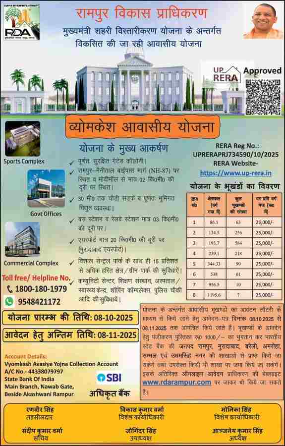 The Rampur Development Authority (RDA) has announced the launch of its new housing initiative — “Vyomkesh Awasiy Yojna” — under the Mukhyamantri Shahri Vistarikaran Yojna. The project aims to provide well-planned residential plots with modern infrastructure and facilities in Rampur district.