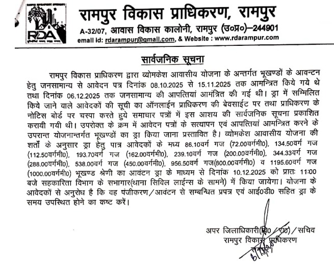 The Rampur Development Authority (RDA) has officially announced the lottery date for its Vamkesh Awas Yojna, following the closure of plot registrations on 15 December. The scheme, which received significant interest from the public, recorded a total of 473 applications against approximately 1,290 available plots, offering strong chances of allotment for eligible applicants.