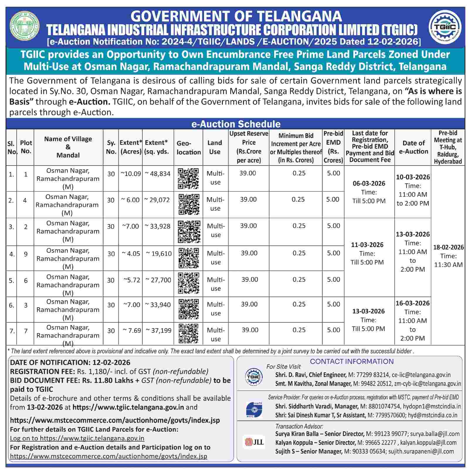 The Telangana government, through the Telangana Industrial Infrastructure Corporation Limited (TGIIC), has invited online bids for the e-auction of 47.75 Acres of government land in the multi-use zone at Osman Nagar, Ramachandrapuram mandal, Sangareddy district. The land is being offered on an “as is where is” basis and is free from disputes, officials said.