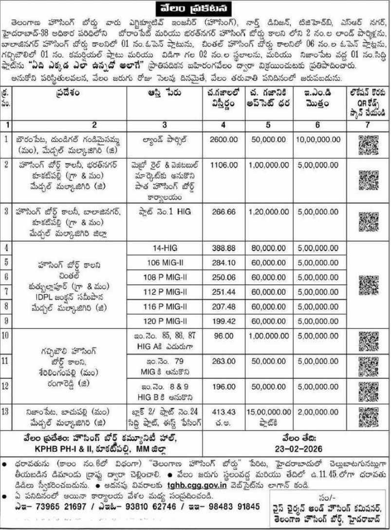 Notifications have also been issued for the sale of Housing Board plots in several districts, including Sangareddy–Sadasivpet, Jogulamba Gadwal, Nizamabad, and other locations.