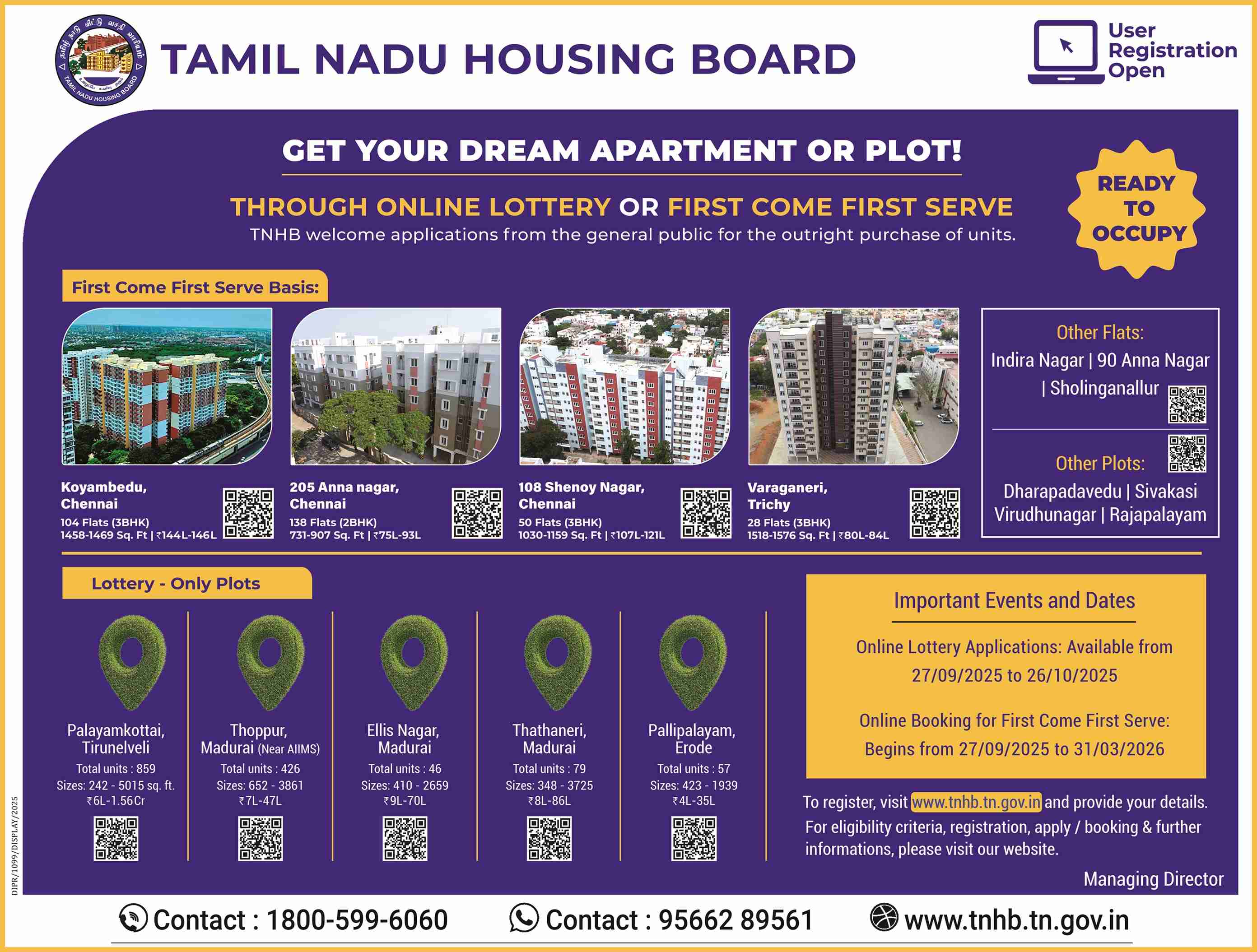 For those preferring to build their own homes, TNHB is also offering residential plots across Tamil Nadu through an online lottery system.