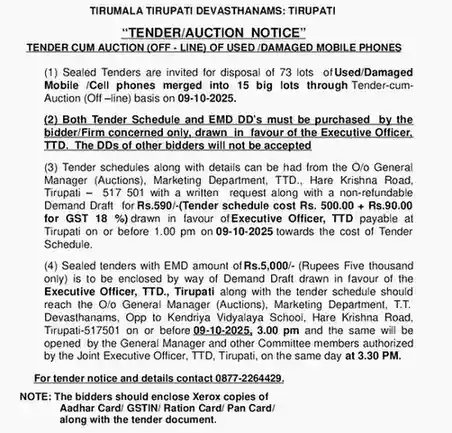 (3) Tender schedules along with details can be had from the O/o General Manager (Auctions), Marketing Department, TTD., Hare Krishna Road, Tirupati – 517 501 with a written request along with a non-refundable Demand Draft for Rs.590/- (Tender schedule cost Rs. 500.00 + Rs.90.00 for GST 18%) drawn in favour of Executive Officer, TTD payable at Tirupati on or before 1.00 pm on 09-10-2025 towards the cost of Tender Schedule.