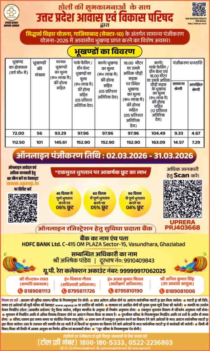 The Uttar Pradesh Awas Vikas Parishad (UPAVP) has invited online registrations for residential plots under Siddharth Vihar Yojana, Sector-10, Ghaziabad. The registration window is open from 02 March 2026 to 31 March 2026, offering 157 freehold residential plots in one of the fastest-growing NCR corridors.