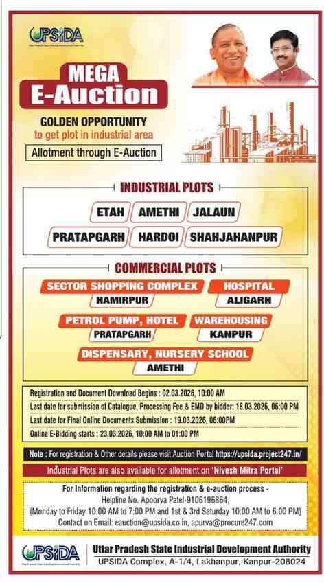 The Mega E-Auction is part of the state government’s broader push to promote industrial growth, create employment opportunities, and strengthen Uttar Pradesh’s investment landscape.