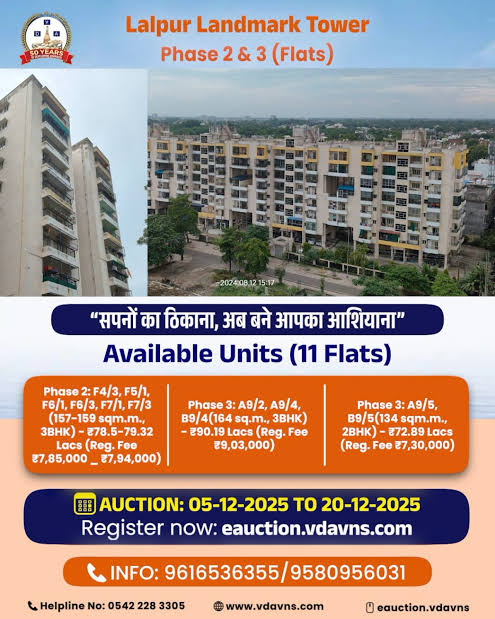 Varanasi: The VDA-backed Lalpur Landmark Tower project has opened e-auction registrations for 11 residential units across Phase 2 and Phase 3, with the bidding window scheduled from December 5 to December 20, 2025. Interested buyers can register on the official portal eauction.vdavns.com.