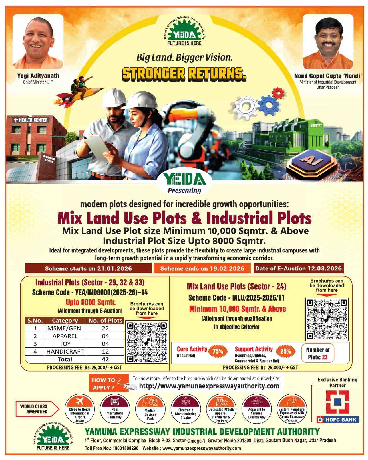 After scrutiny of applications, eligible applicants will be allowed to participate in an online e-auction through YEIDA’s official portal. A minimum of three valid bidders is required for conducting an auction for a plot.