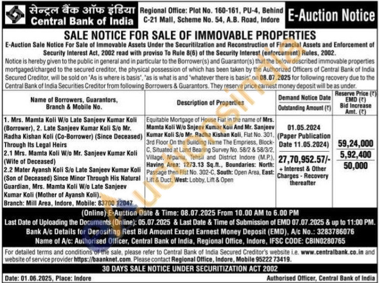 Equitable Mortgage of House Flat in the name of Mrs. Mamta Koli W/o Snjeev Kumar Koli And Mr. Sanjeev Kumar Koli S/o Mr. Radha Kishan Koli, Flat No. 301. 3rd Floor On the Building Name The Empriess, Block C. Situated at Land Bearing Survey No. 58/2 & 58/3/2, Village, Nipania, Tehsil and District Indore (M.P.). Having Area: 1273.13 Sq.ft., Boundaries: North: Passage then Flat No. 302-C, South: Open Area, East: Lift & Duct, West: Lobby, Lift & Open