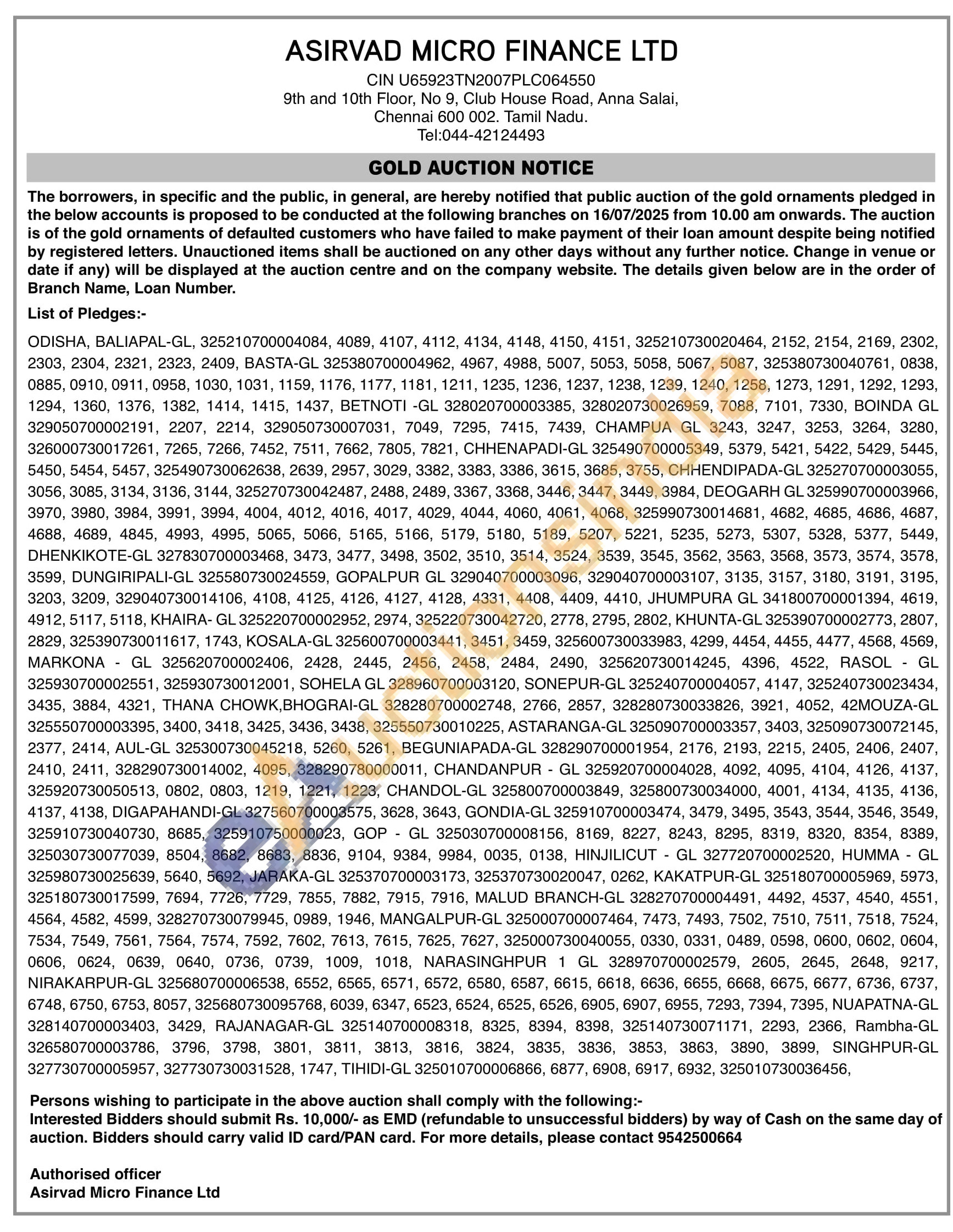 Asirvad Micro Finance Ltd Gold Auctions Auction in Chennai