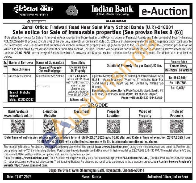 Equitable Mortgage of Land & Building constructed over Gata No.811. Mauja Bhatipura, Ward no. 7, mahoba, Near Bus Stand having area 92.94 Sq. Mt. Owned by Nafees S/o Natthoo.