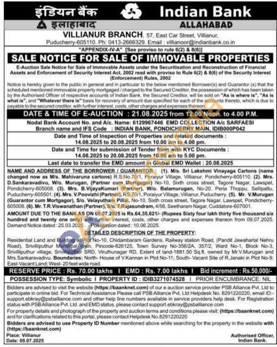 DETAILED DESCRIPTION OF THE PROPERTY: Residential Land and Building at Plot No-10, Chidambaram Gardens, Railway station Road, (Pandit Jawaharlal Nehru Road), Srivilliputhur Municipal town, Pincode-626125, Town Survey No-356/2A, 357/2, Ward No-1, Block No-3. Srivilliputhur village, Srivilliputhur SRD, Viruthunagar RD, Extent of land-1881.50 Sq.ft. owned by Mr.V.Murugan and Mrs. Sankaravadivu. Boundaries: North-House of V.Kannan in Plot No-11; South- Vacant Site of R.Janaki in Plot No-9: East-Vacant Land; West-20 feet wide road