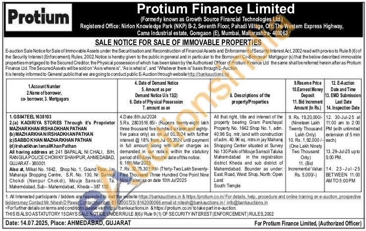 All that right, tille and interest of the property bearing Gram Panchayat Property No. 1642 Shop No. 1, adm. 40.96 Sq. mir, land with construction of adm. 40.96 sq. mirs in jay Maharaj Shopping Center situated at Survey No 130 Paiki of Mouje Sansoli Taluka Mahemdabad in the registration district Kheda and sub district of Mahemdabad. Bounder as under: East Road, West: Shop, North: Open Land