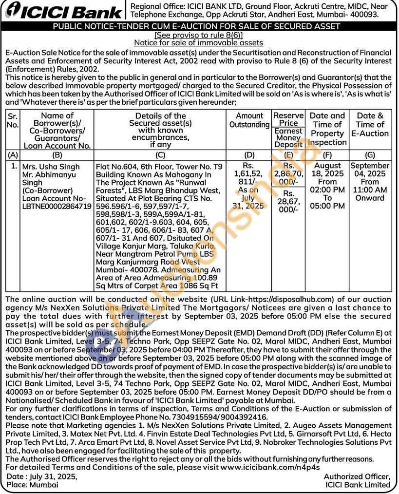 Flat No.604, 6th Floor, Tower No. T9 Building Known As Mahogany In The Project Known As "Runwal Forests", LBS Marg Bhandup West, Situated At Plot Bearing CTS No. 596.596/1-6, 597,597/1-7, 598,598/1-3, 599A,599A/1-81, 601,602, 602/1-9.603, 604, 605, 605/1-17, 606, 606/1-83, 607 A, 607/1-31 And 607, Dsituated On Village Kanjur Marg, Taluka Kurla, Near Mangtram Petrol Pump LBS Marg Kanjurmarg Road West Mumbai-400078. Admeasuring An Area of Area Admeasuring 100.89 Sq Mtrs of Carpet Area 1086 Sq Ft